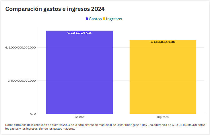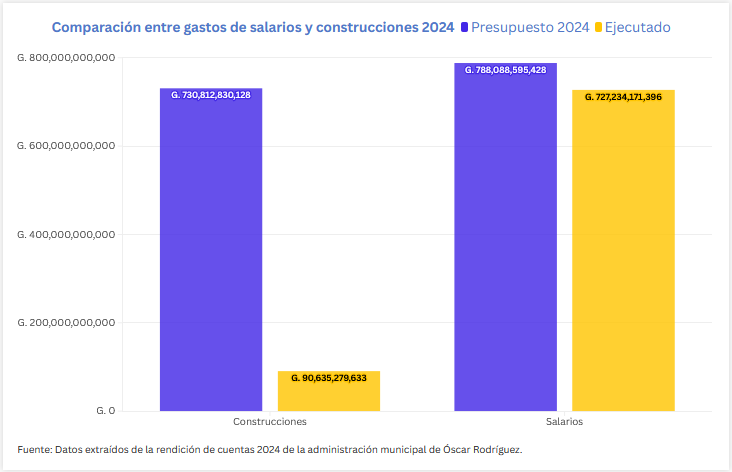 Los funcionarios representan un peso financiero que impide destinar fondos a obras públicas, mejora de servicios básicos o atención a las necesidades reales de la ciudadanía. En comparación, la municipalidad gastó solo G. 90.635.279.633 en construcciones en 2024.